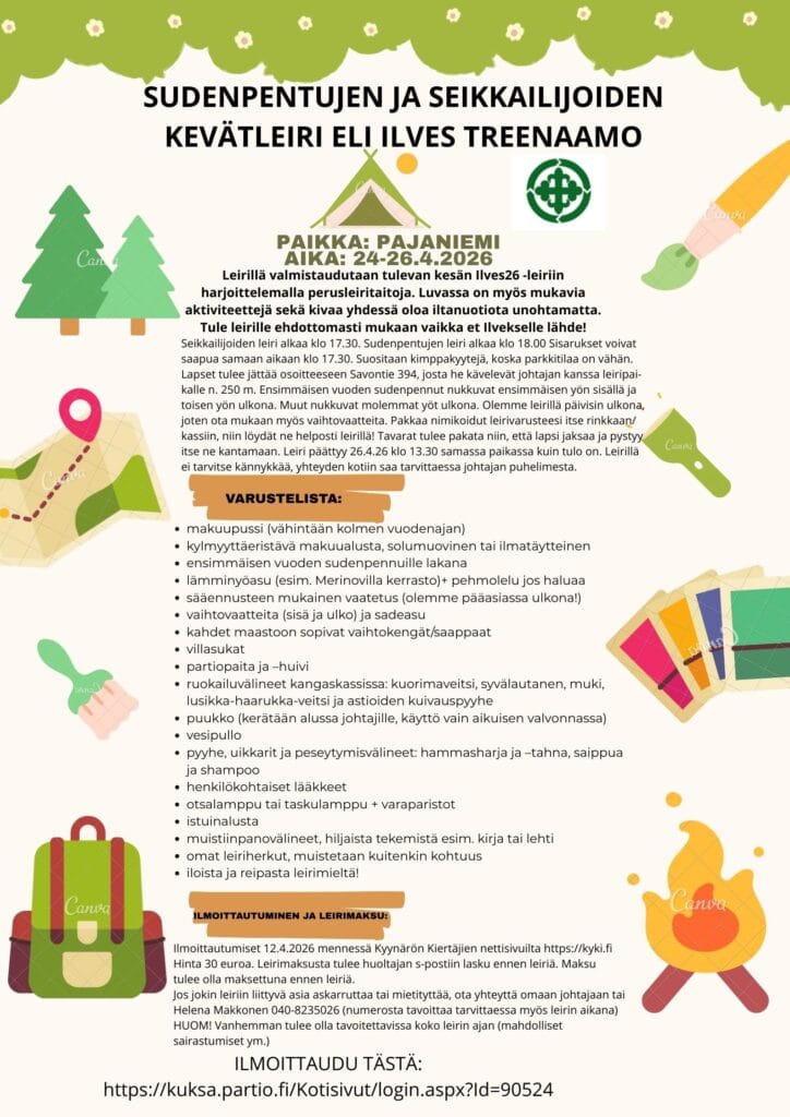 Sudenpentujen ja seikkailijoiden ilmoittautuminen: https://kuksa.partio.fi/Kotisivut/login.aspx?Id=90524